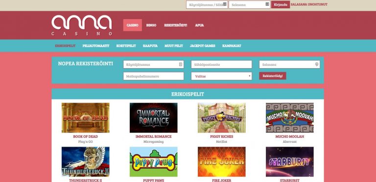 AnnaCasino on ehdottomasti kaikkien naisten suosikkipelipaikka ja ainutlaatuinen kasinoelämys. Tällä kasinolla pelatessa ei tule aika pitkäksi, sillä pelejä ja tarjouksia löytyy jokaiseen makuun. Uniikin tästä kasinosta tekee yhteisöllisyys; voit pelata yhdessä kavereittesi kanssa ja jutella bingo-chatissa samalla kun jahtaat suuria voittoja. AnnaCasino on yksi harvoista nettikasinoista, joka on luotu nimenomaan naispelaajia ajatellen, ja siinä on mielestämme onnistuttu erittäin hyvin. Sivusto on selkeä ja helppo käyttää, miellyttävä silmälle ja pelivalikoima on laaja. Miinuksena täytyy kuitenkin mainita live-chatin puuttuminen.